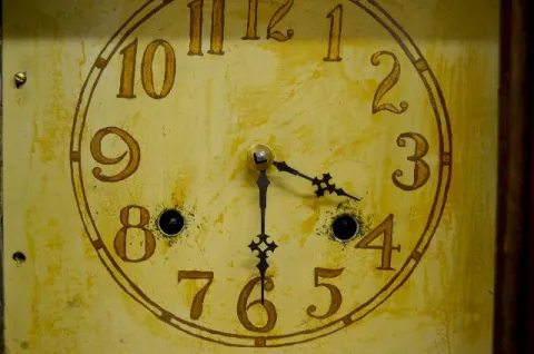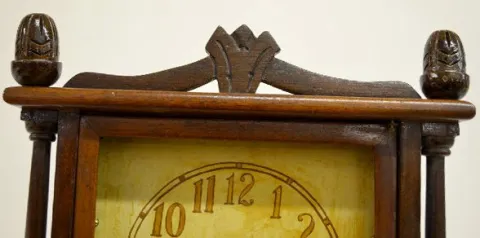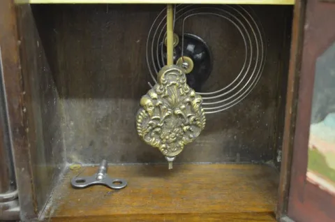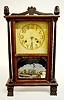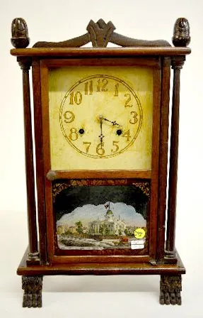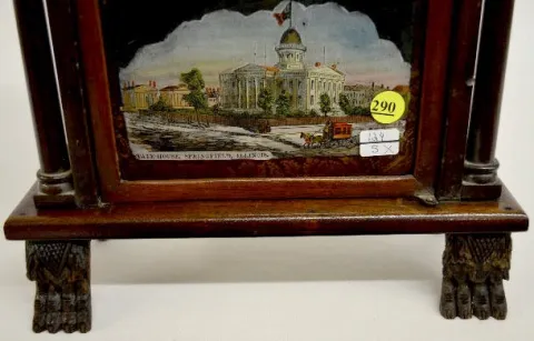 With a New Haven T&S movement; a painted metal dial; and in a case with the Springfield, Illinois State House on the lower door; acorn finials; 2 pill...