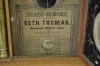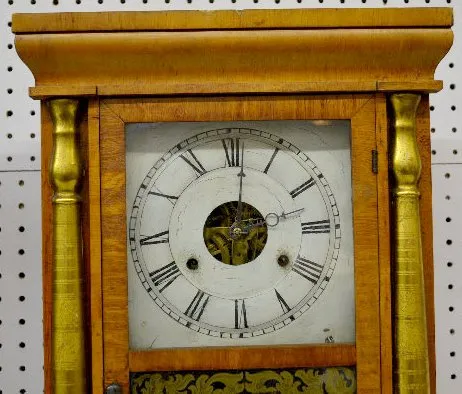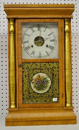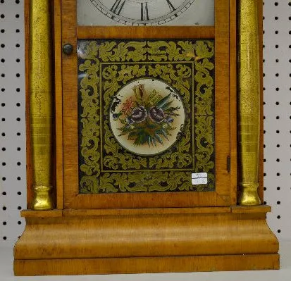 With a T&S visible movement marked "S. Thomas"; a painted metal dial; a good interior label; the pendulum; key and weight. The door is floral painted....