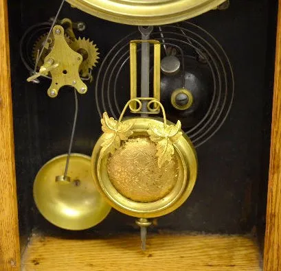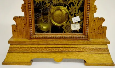 With a T&S and alarm movement; a marked paper dial and the pendulum. The oak case has a label on the back and a decorated glass door. The clock is run...