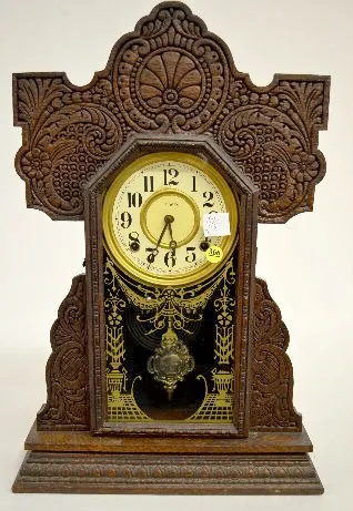 With a T&S movement signed "E. Ingraham"; a marked paper dial; a decorated door and the pendulum. The clock is running and striking at this time. (The...