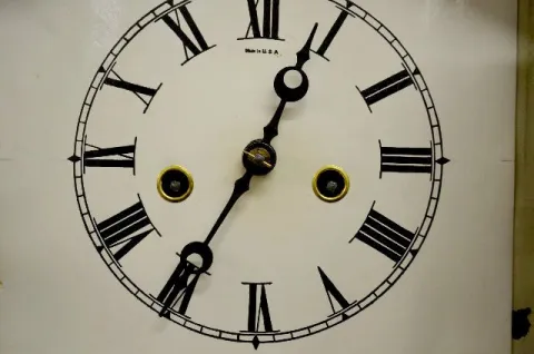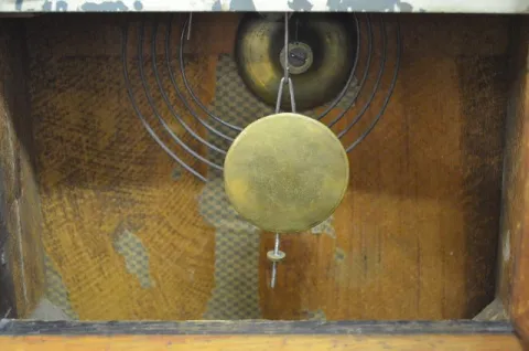 With a T&S movement; a paper dial attached to an old painted tin dial; an inside door label and the pendulum. The clock is running and striking at thi...