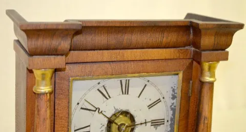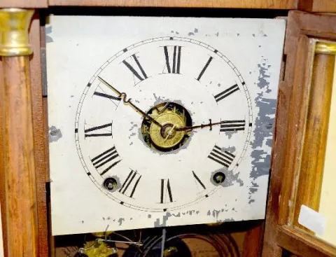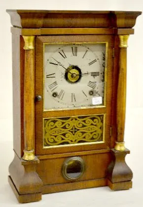 With an 8 day T&S with alarm movement and a painted tin dial with ST hands. In a veneer case with 2 columns, a stenciled lower door and a good interio...