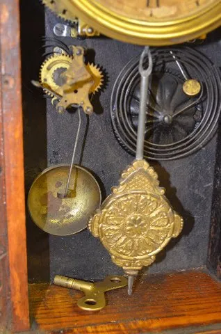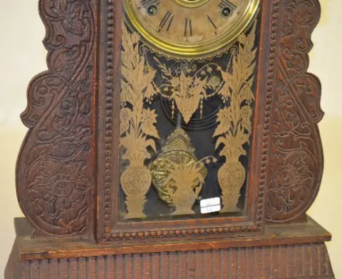 With an 8 day T&S movement with alarm and 1/2 hour strike. There is a marked paper dial with a brass pan and an ornate brass pendulum. The oak case ha...