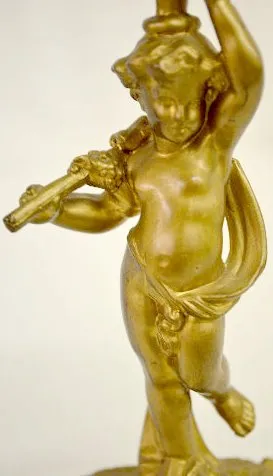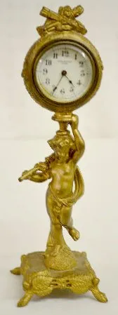 1.) New Haven Figural Novelty Clock: A classical youth with a scepter supports the clock on his head. In a painted gold spelter case. Dial - 2" Diamet...
