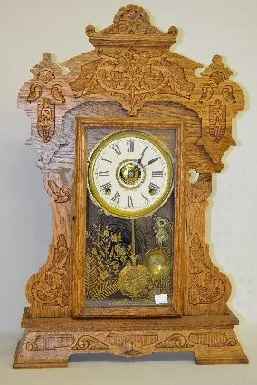 From the "Exposition Series" with a T&S with alarm movement; a paper dial marked "Seth Thomas"; an interior paper label and one on the back; the pendu...