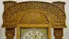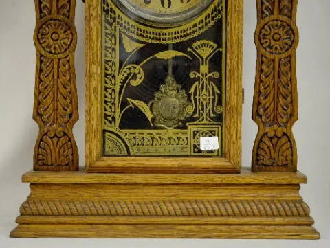 With a T&S movement; a marked paper dial; a decorated glass door; and the pendulum. The clock is running and striking at this time. (The dial is disco...
