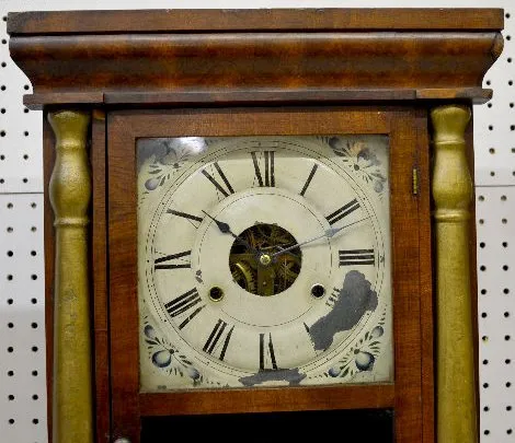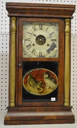 The rosewood veneered case with gilt columns has a visible, marked, T&S movement; an unmarked painted metal dial; a good interior label; 2 weights; th...