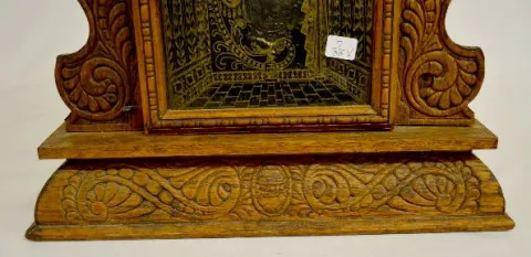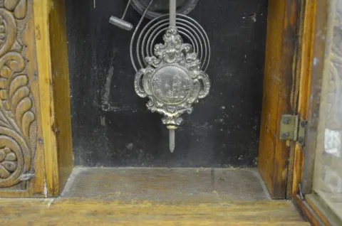 With a T&S movement; an unmarked paper calendar dial; a decorated glass door; a paper label on the back and the pendulum. The clock is running and str...