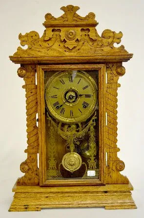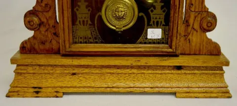 With a T&S with alarm movement; a paper dial marked "Seth Thomas"; an interior and rear label; and a lion head pendulum. The clock is running and stri...