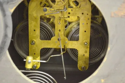 With a signed T&S movement; a painted metal dial marked "S.T." and the pendulum. The caramel colored adamantine case has a partial paper label; an ada...