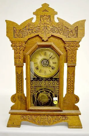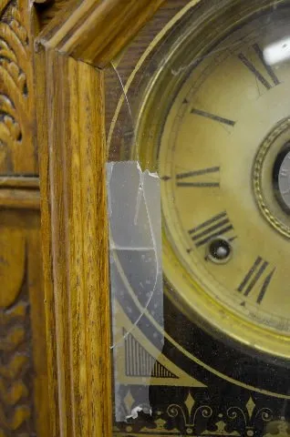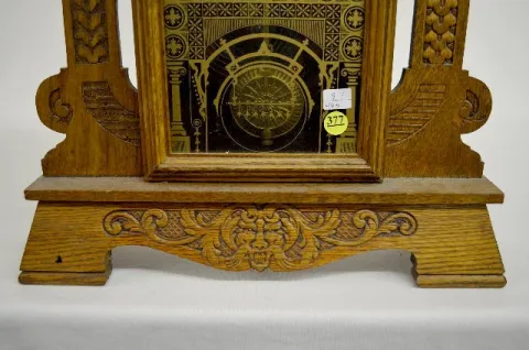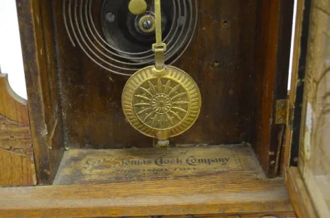 With a T&S and alarm movement; a paper dial marked "Seth Thomas"; the pendulum and key. The oak case has both an interior and exterior label and a dec...
