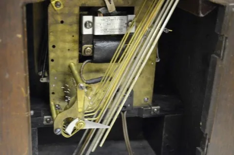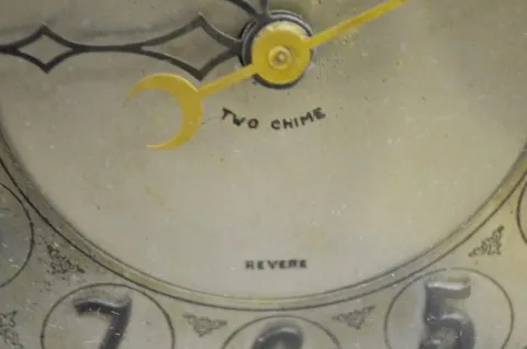With a signed "Revere" movement; an engraved and marked silvered dial with raised numerals and an inside instruction label. The clock is running and s...