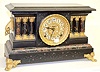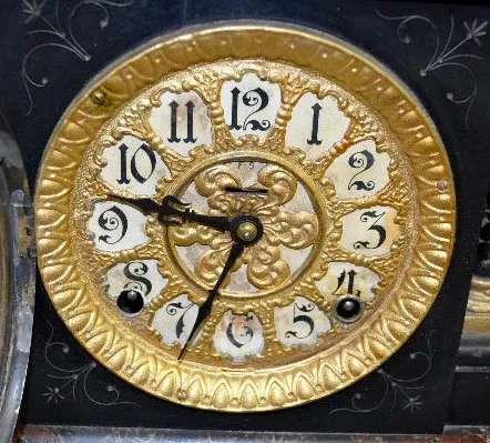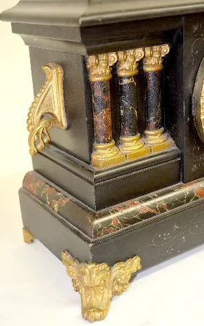 With an 8 day T&S with 1/2 hour strike movement and an unmarked paper dial with a fancy metal sash. In a black enamel case with red/black marbleized m...