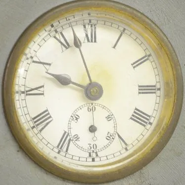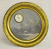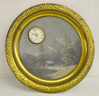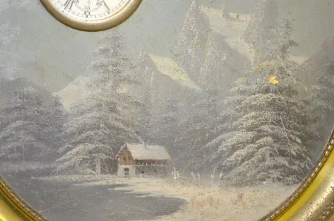 A scene of a cabin dwarfed by large pine trees and craggy rock formations is below the paper dial. With a fixed key winder. The outer rim has a hammer...