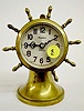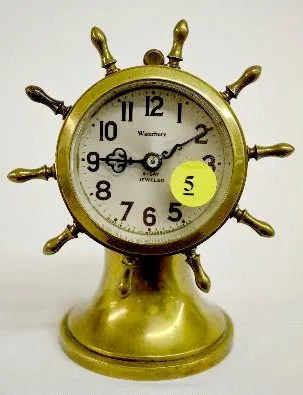 The clock is wound by turning the ships wheel. It has a silvered metal dial marked "Waterbury 8 day Jeweled" and is in a brass case. (The clock is not...
