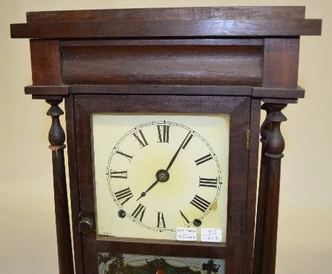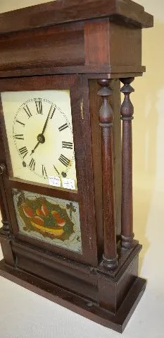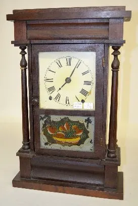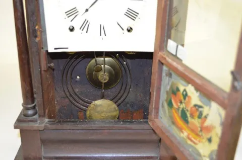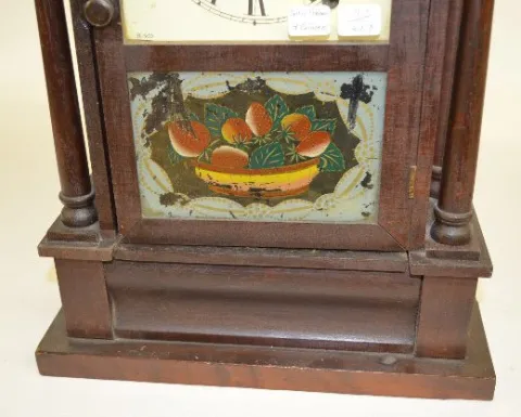 With a signed T&S Seth Thomas movement; an unmarked paper dial; the pendulum and key. The glass door has a bowl of strawberries painted on it. The clo...