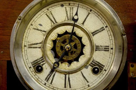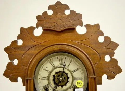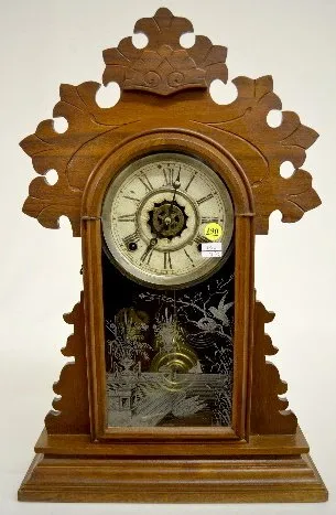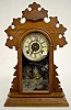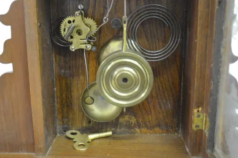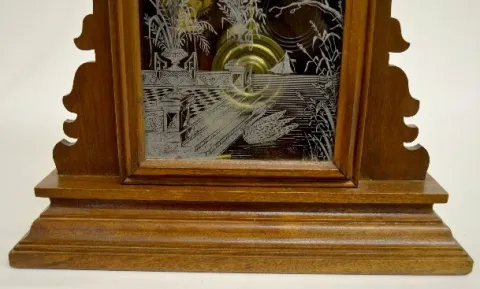 With a signed T&S and alarm movement; an unmarked painted tin dial; a partial label; the pendulum and key. The case has a decorated glass door. The cl...