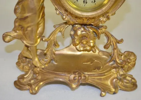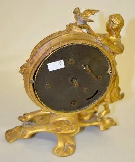 With a set key wind movement and a porcelain dial marked "G". The case has a lady with a bird in her hand. (The clock is not running at this time.) 9"...