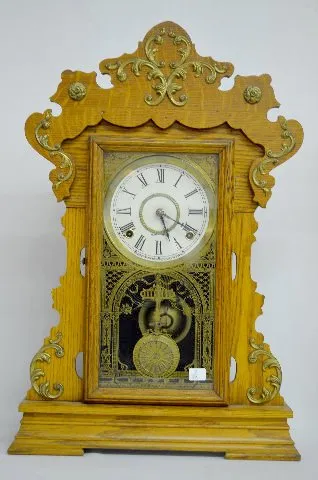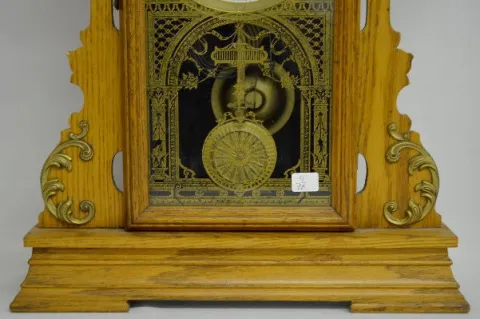 With a T&S movement; a paper dial marked "Seth Thomas"; a decorated glass door; the pendulum and key. The clock is running and striking at this time. ...