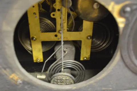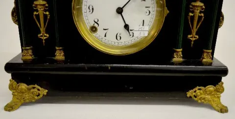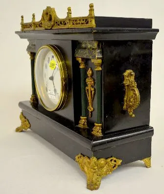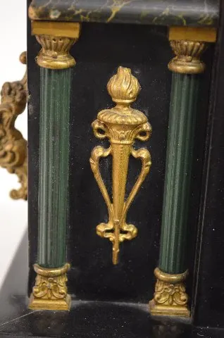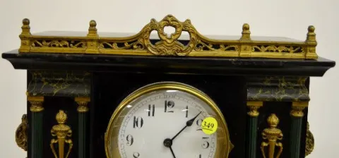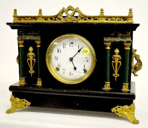 With a T&S movement; a marked ivoroid dial; the pendulum and key. The case is enameled black wood with faux marble; green columns; brass trim and conv...