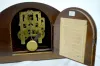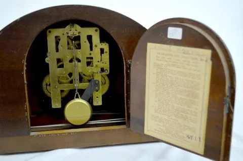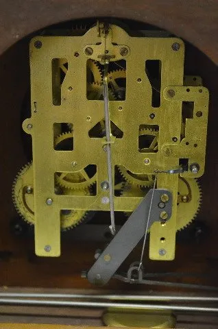 With a T&S - 2 bar strike movement; a metal cut out dial with a Seth Thomas tag; a "Guarantee" label on the inside of the door; and the pendulum. The ...