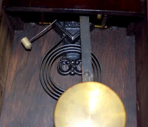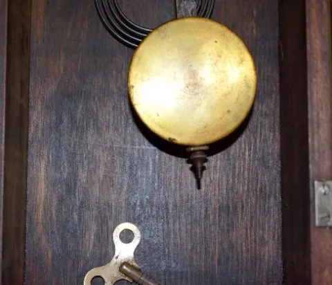 With an 8 day T&S movement; a signed porcelain dial; the pendulum and key. Not tested. 18 3/4" Tall...