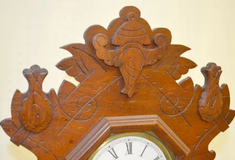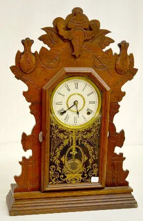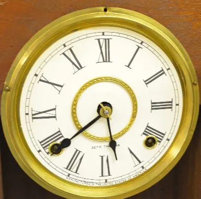 With an 8 day T&S, 1/2 strike and wire gong movement and a signed paper dial. The door is stenciled with a medallion and laurel leaves and shells. The...