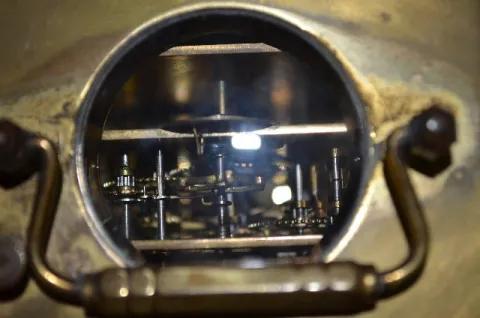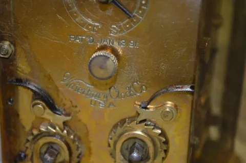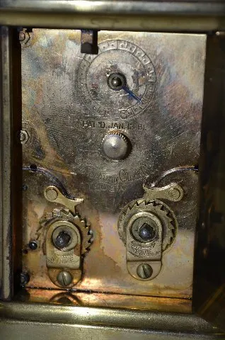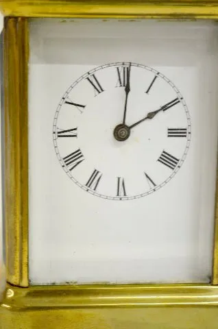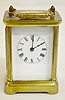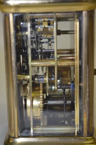 With an 8 day, time with bell strike, alarm and repeat movement in a gilt case with beveled glass on 3 sides and the top. The clock is running and str...