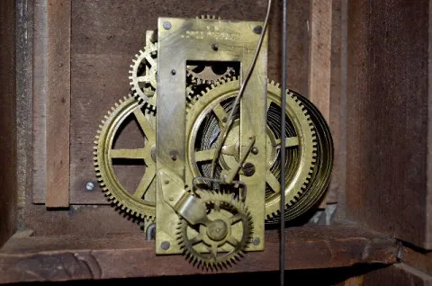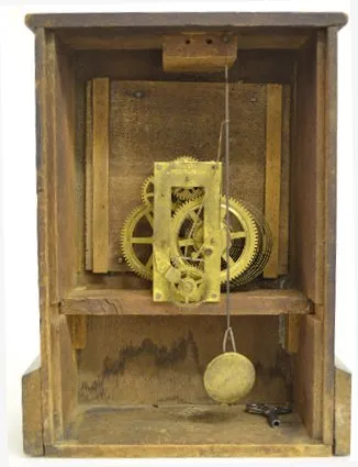All wood with signed brass works; the pendulum and the key. The clock is running at this time. (There is a new back on the clock.) 12" Tall...