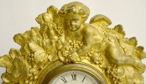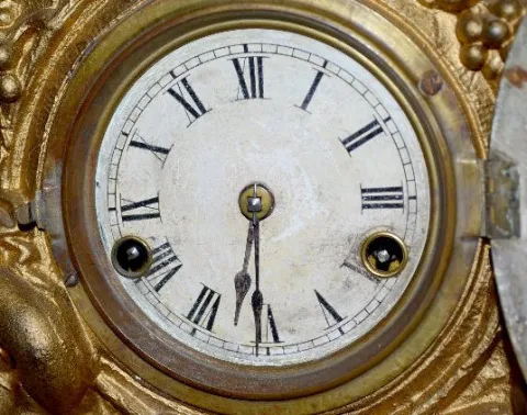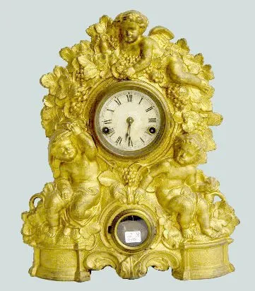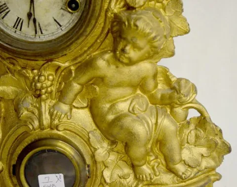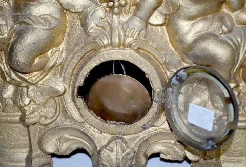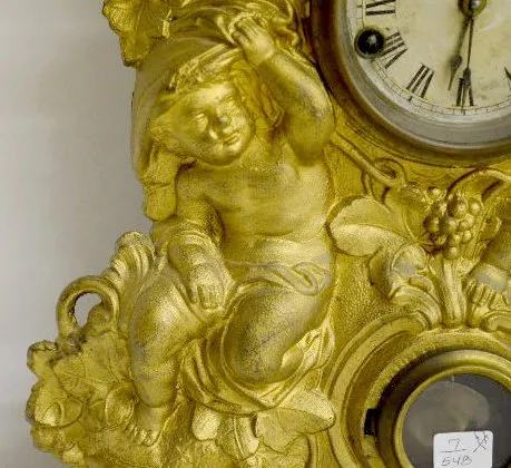 With an 8 day T&S movement; an unmarked paper dial and the pendulum. In an iron front case with 3 cherubs, grapes and leaves. The clock is running at ...