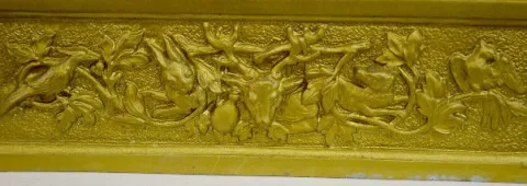 With a T&S movement; a paper dial marked "WCC"; and the pendulum. The case has acorns and oak leaves; deer, dogs and a hunter on one panel. The bottom...