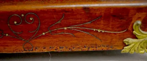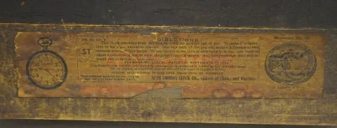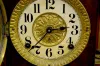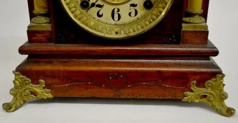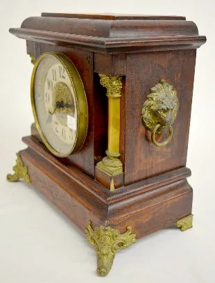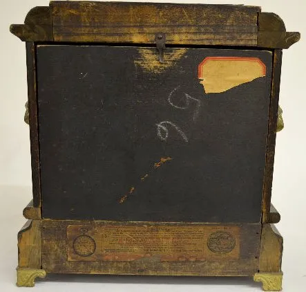 With a signed T&S movement; an unmarked paper dial; the pendulum and key. The adamantine case has faux ivory columns and lion head decorations. (The c...