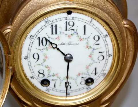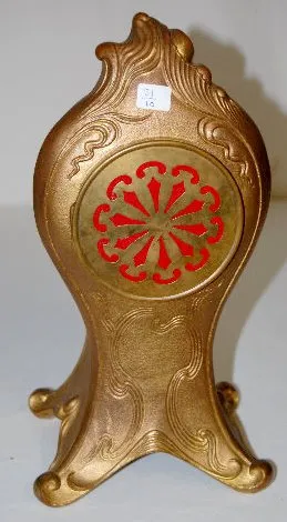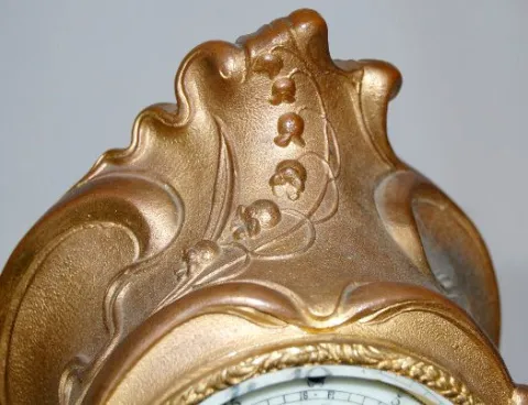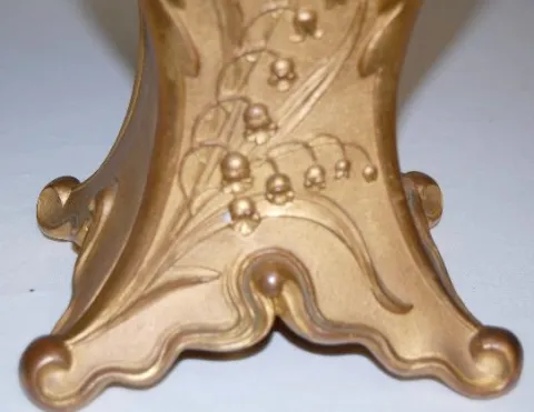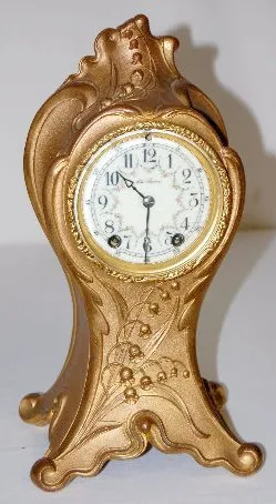 Made of white metal with Lily of the Valley designs. (The enamel dial is damaged. There is wear to the finish on the case. There is no pendulum with t...