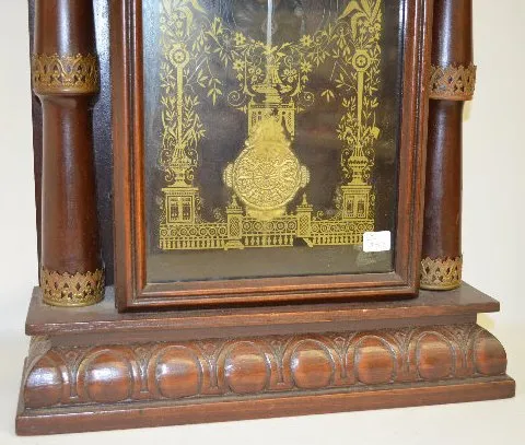 With a T&S movement; a marked paper dial; a decorated glass door and the pendulum. The clock is running and striking at this time. (The dial is discol...