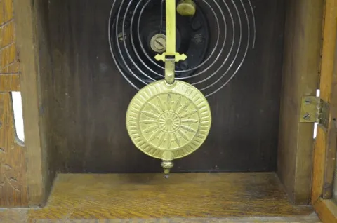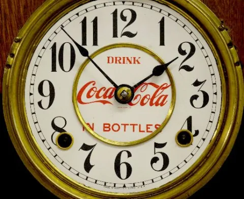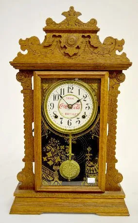 With a signed T&S movement; a newer paper dial that reads "Drink Coca Cola in Bottles"; a decorated glass door and the pendulum. The clock is running ...