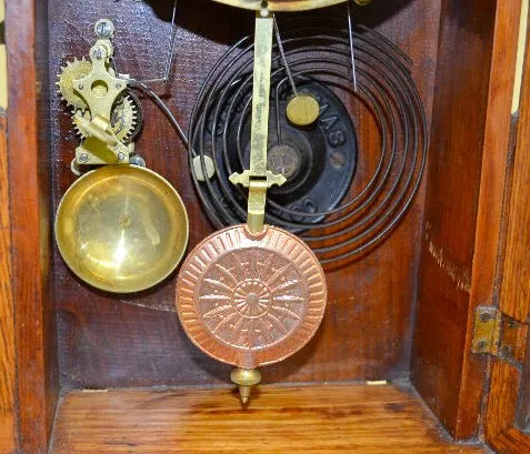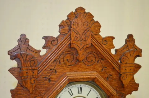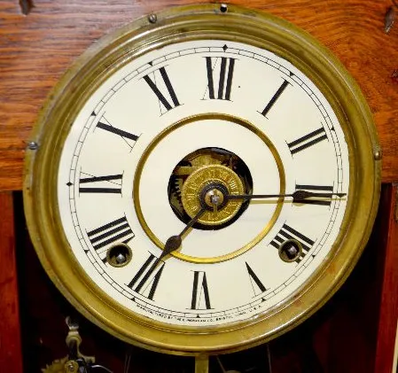 With an 8 day T&S with alarm and 1/2 hour strike movement. There is an Ingraham paper dial. The door is stenciled with ferns and flowers. There is a s...