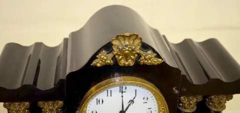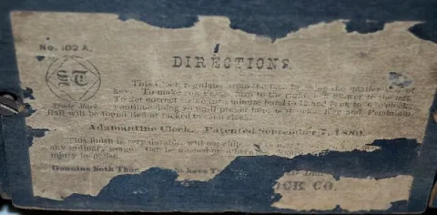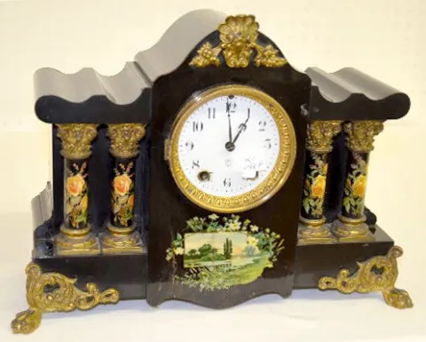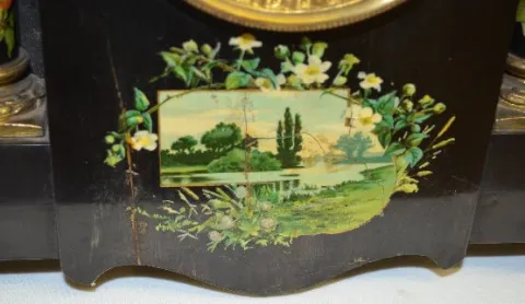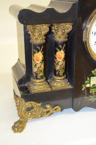 With an 8 day T&S movement and a marked porcelain dial. In an enameled wood case with rose decal pillars and a lake scene on the front, metal ornament...