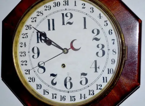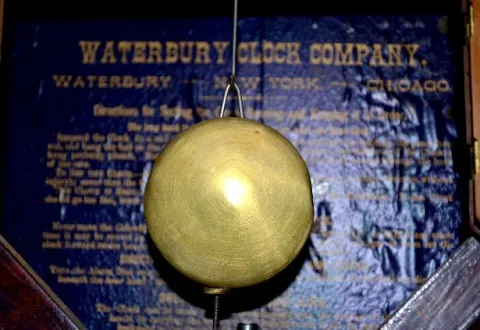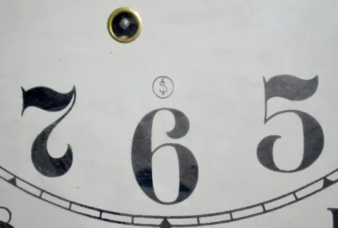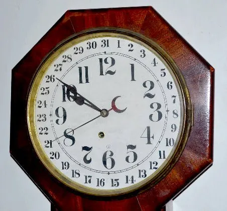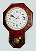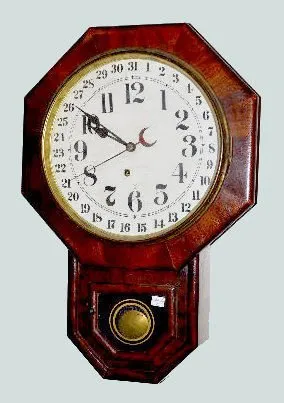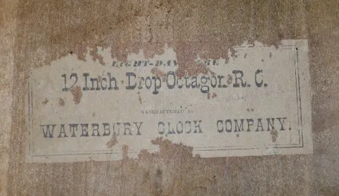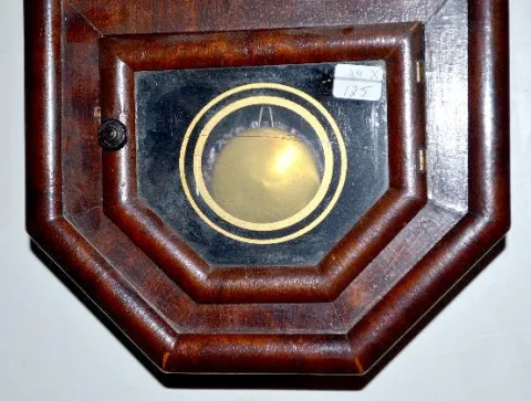 T.O.; unmarked paper calendar dial; has pendulum; good interior label; good exterior label on the back; veneer case. Not tested. ( Corrosion to the be...
