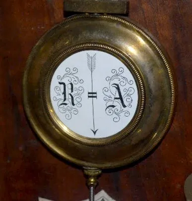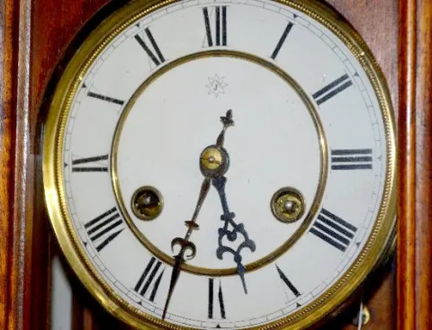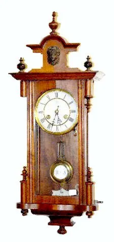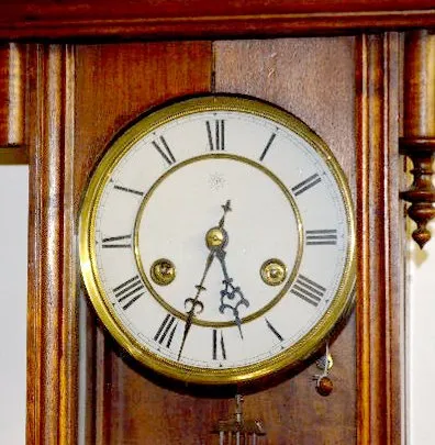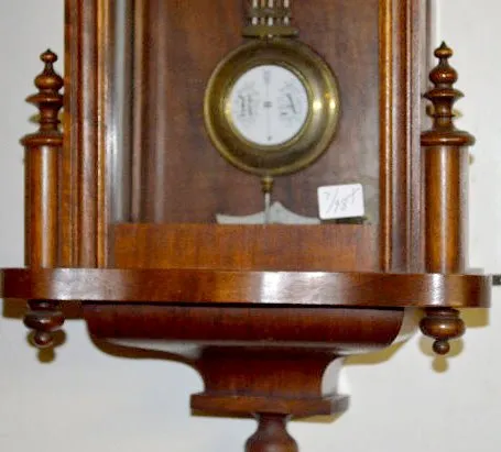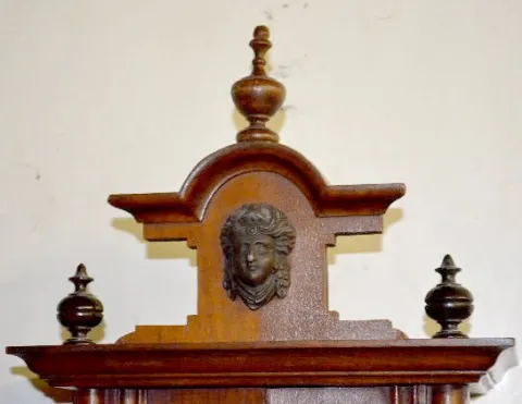 With an 8 day T&S movement; a marked painted metal dial; an RA pendulum and the key. The case has a lady head crest. Not tested. (One finial on the do...