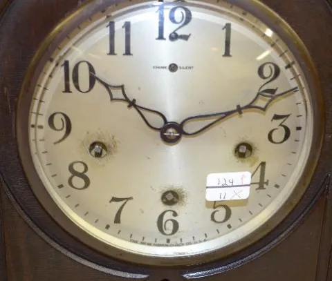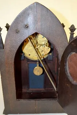 With a Time, Strike and Chiming movement with 5 Bar strike and marked "Patented 1 - 1 - 8"; a marked silvered dial; the key and pendulum. The clock is...