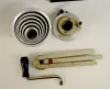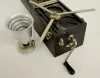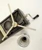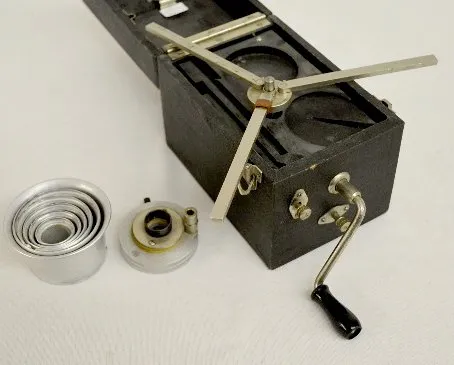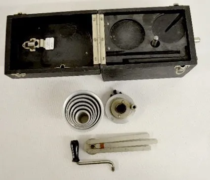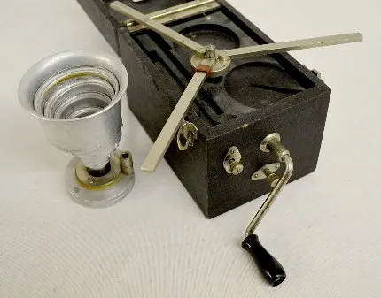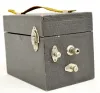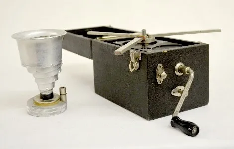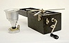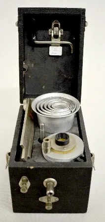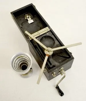 The black case contains a tripod record holder; speaker; the crank and a collapsible horn. (The phonograph is not running at this time. ) (The crank a...