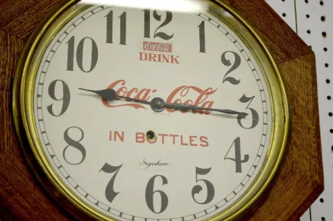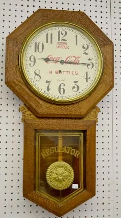 With a TO movement; a paper dial marked "Ingraham" and reads "Drink Coca Cola in Bottles"; the pendulum and key. Not tested. (The dial is not original...