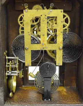 With a T&S and alarm marked movement; an unmarked paper dial; and the pendulum. The clock is running and striking at this time. (There is no key with ...