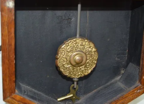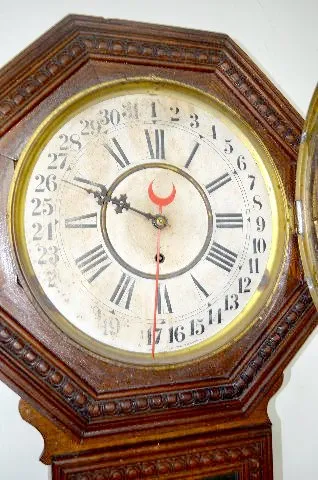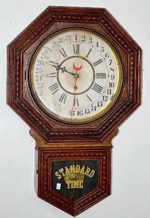 In an oak case with the original finish. Not tested. (The dial has stains and is faded. The case has minor flaws.) Dial - 11" Diameter; Case - 28" Lon...