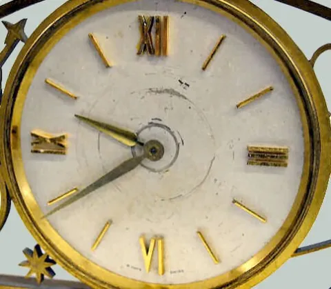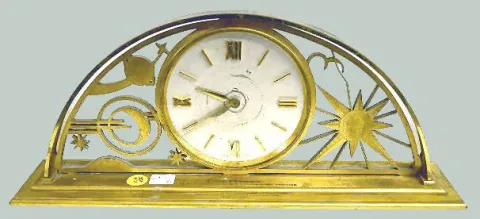 With a set key wind movement and a marked metal dial with raised Roman Numerals. In a brass case with the sun, moon, stars and a planet on it. The pre...