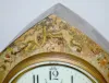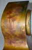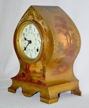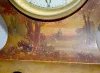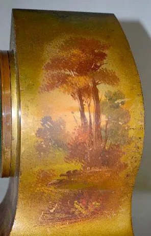 With a signed 8 day T&S movement and a signed and decorated porcelain dial. The metal case is painted with cherubs, trees and scenery. Not tested. 12"...