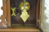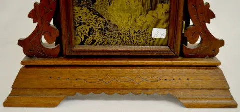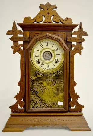 With a T&S and alarm movement; a paper dial marked "Ingraham"; a good interior label and a Niagara decorated glass door. The pendulum is with the cloc...
