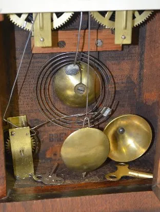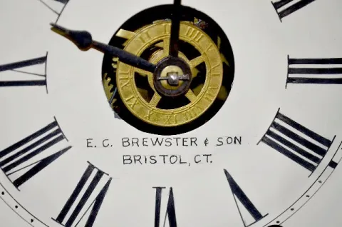 With an 8 day T&S movement with alarm and a painted tin dial that has "E.C. Brewster & Son Bristol, CT" hand painted on it. In a veneer case with a fr...