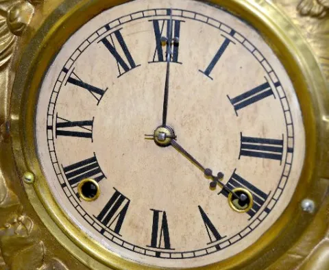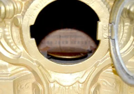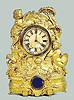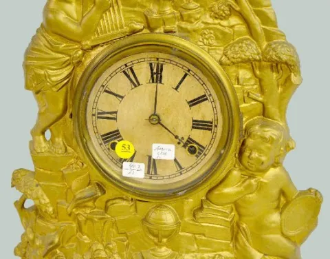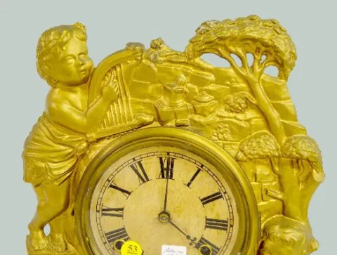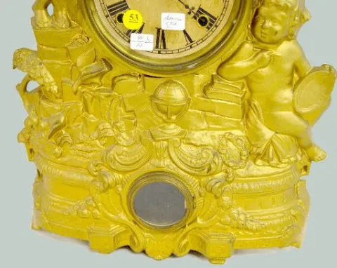 With an 8 day T&S movement and an unmarked paper dial. The metal case has 2 cherubs with a harp and art; books; globe and birds. There is a paper labe...