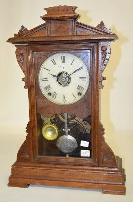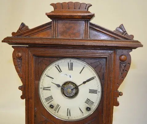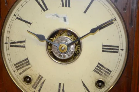 With a T&S movement; an unmarked paper and metal dial; a plain glass door and the pendulum. The clock is running and striking at this time. (The dial ...